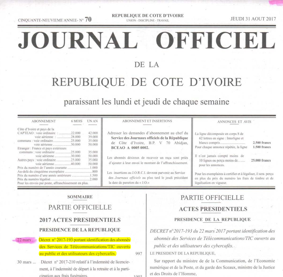 Ce document du Journal Officiel de Côte d’Ivoire du 31 août 2017 contient principalement le décret n° 2017-193 du 22 mars 2017 portant identification des abonnés des services de télécommunications/TIC ouverts au public et des utilisateurs des cybercafés. Ce décret établit des règles strictes d’identification obligatoire pour tous les abonnés aux services de télécommunications et les utilisateurs de cybercafés, exigeant la présentation de pièces d’identité officielles et la conservation de ces données par les opérateurs.