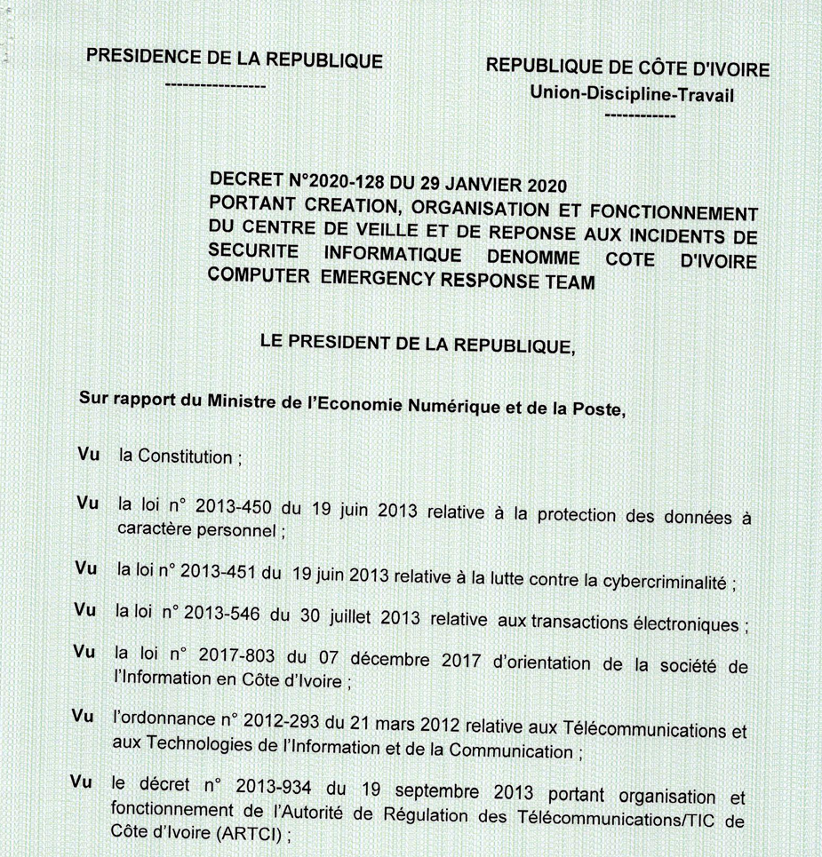 Décret N° 2020-128 du 29 janvier 2020 portant création, organisation et fonctionnement du Centre National de Veille et de Réponse aux incidents de sécurité informatique dénommé CI-CERT