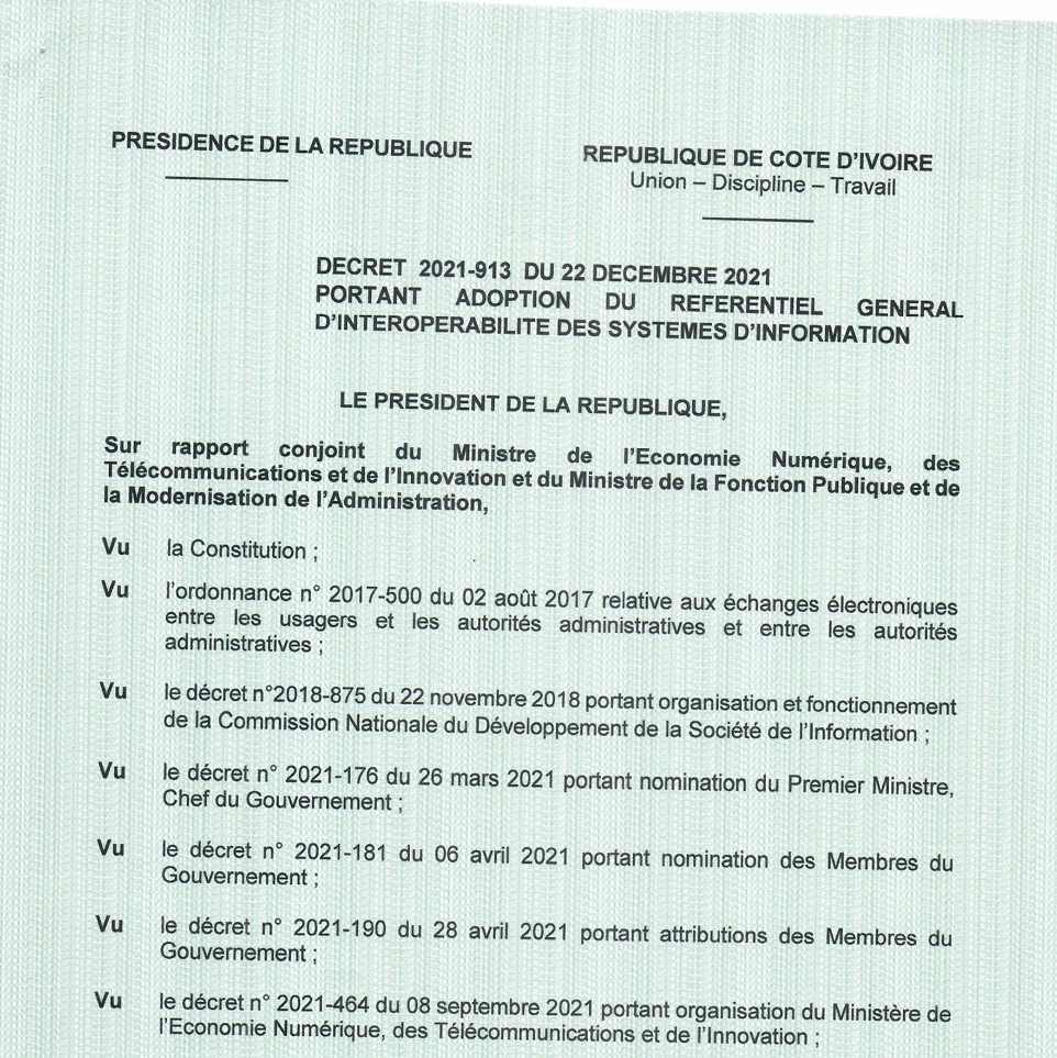 Décret N°2021-913 du 22 décembre 2021 portant adoption du référentiel général d’interopérabilité des systèmes d’information