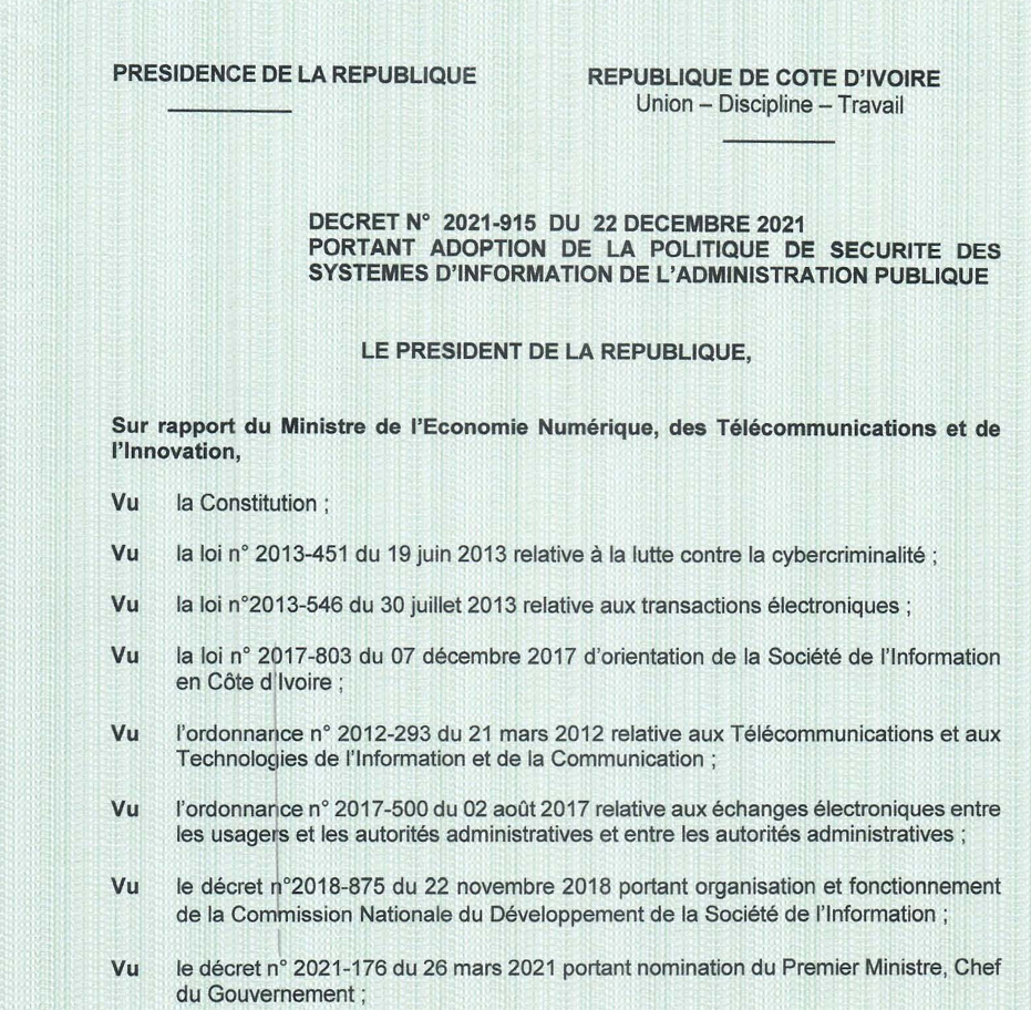 Décret N°2021-915 du 22 décembre 2021 portant adoption de la politique de sécurité des systèmes d’information de l’administration publique