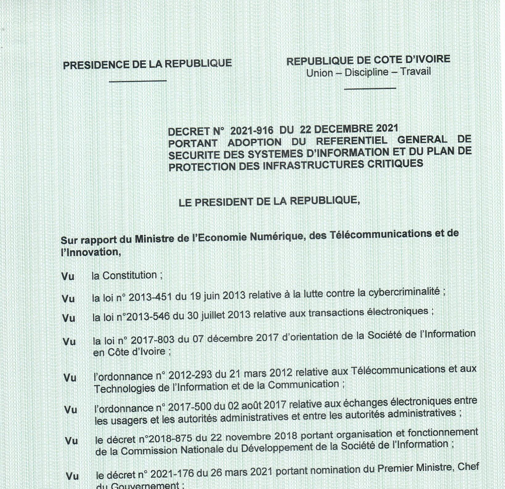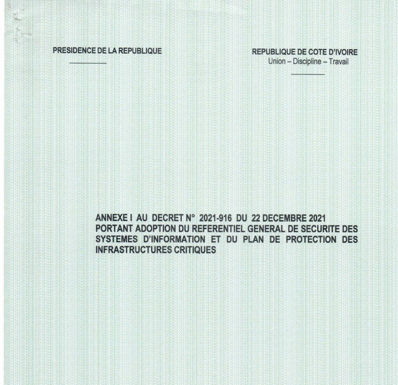 Décret N°2021-916 du 22 décembre 2021 portant adoption du Référentiel Général de Sécurité des Systèmes d’Information (RGSSI) et du Plan de Protection des Infrastructures Critiques (PPIC)